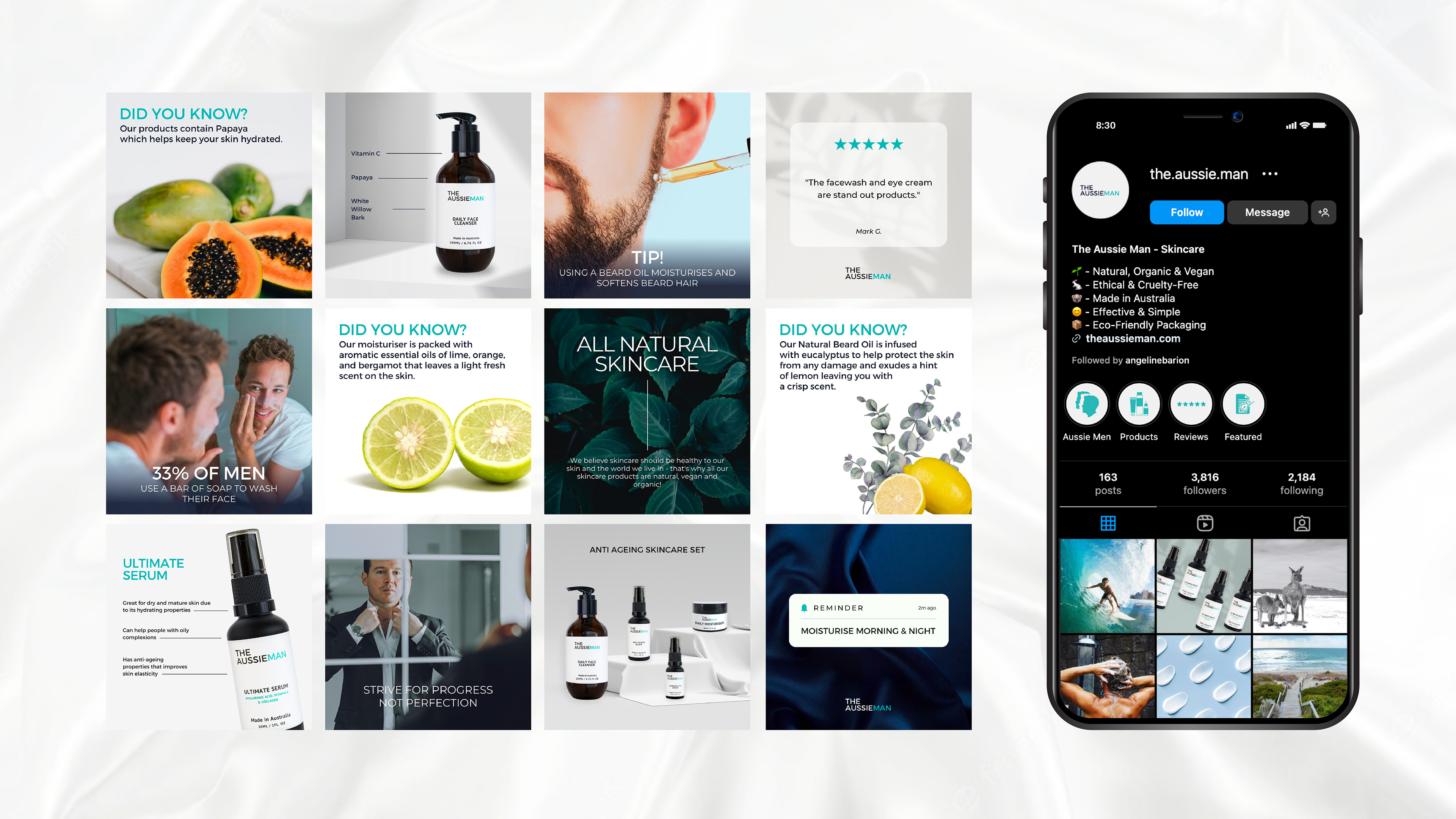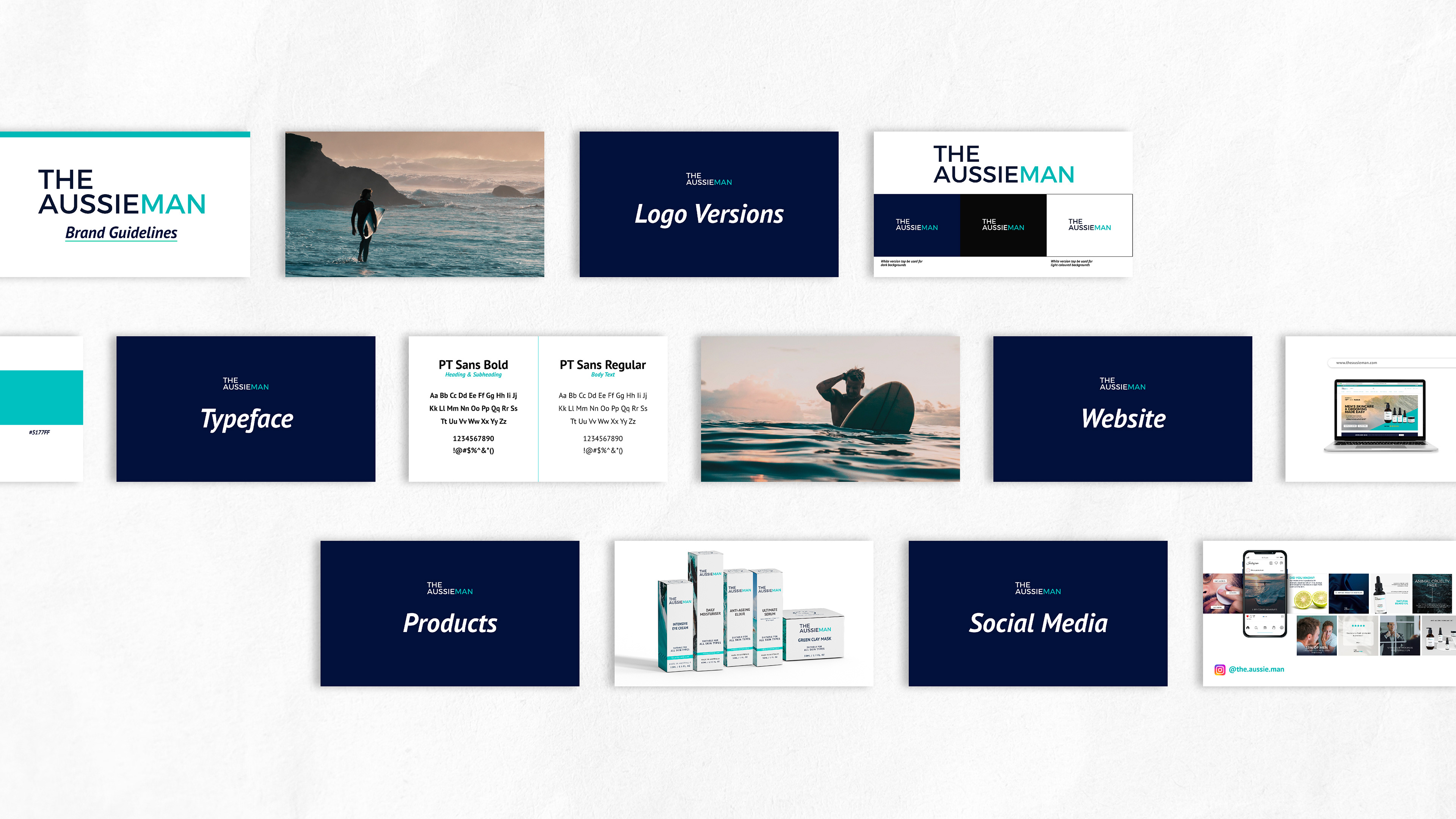 Created the overall rebrand of The Aussie Man including but not limited to building a visual brand guide, revamping the website and social media accounts, and most importantly, redesigning the label and packaging of the products.